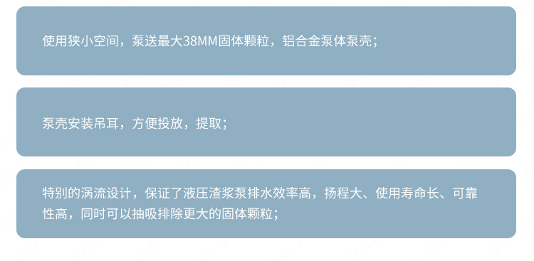 使用狹小空間,泵送最大38mm固體顆粒,鋁合金泵體泵殼